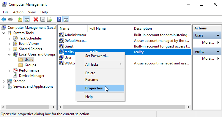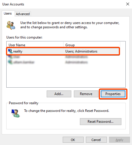 On **User Accounts** Window > **Users** tab, select "**reality**" user and click on PROPERTIES