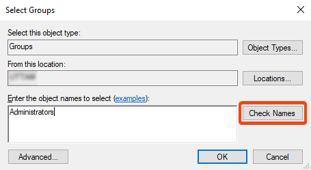 On the Select Groups window, Enter the object name as **Administrators** (subject to change depending on computers\` language settings) and click on CHECK NAMES