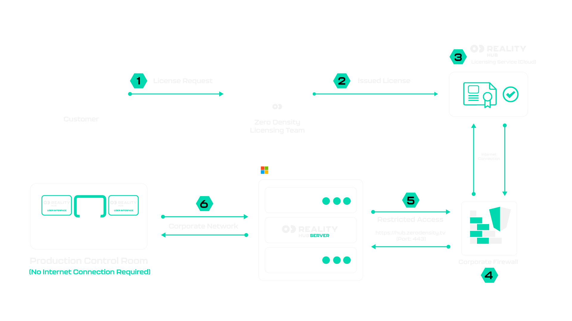 Corporate Firewall grants access only to Cloud Licensing Service (https://hub.zerodensity.tv Port TCP 443)