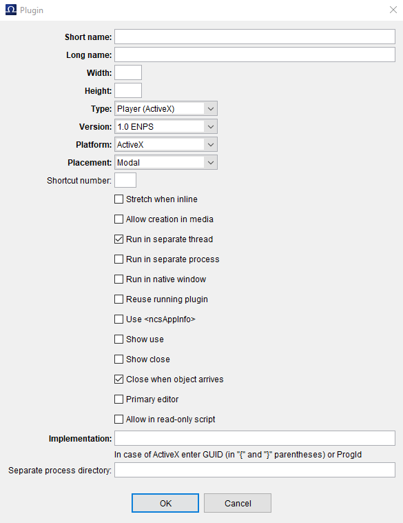 In the Plugin configuration window, fill in the areas shown in the image above and proceed to the Implementation property phase.