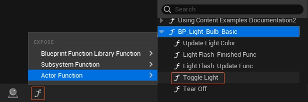 Go to Actor Function > select the Toggle Light function located under the BP Light Bulb Basic actor, as visualized above.