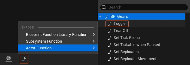 Go to Actor Function > select the Toggle function located under the BP Gears actor, as illustrated above.