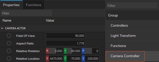 Drag and drop Camera Actor Properties into the Camera Controller Group, as shown above.