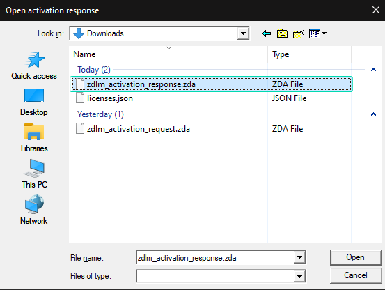 * Select the Activation Response file (\*.zda) and click **Open**, as illustrated above.&#x20;