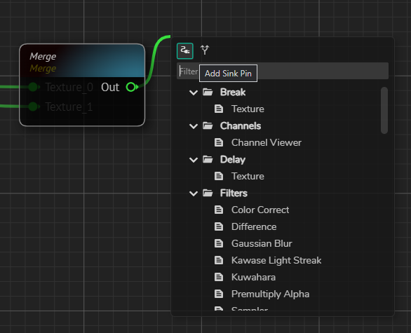 The Sink pin is a unique tool for creating an endpoint for the nodegraph. When you create a Sink node, you essentially generate the node that initiates the execution of the entire nodegraph.