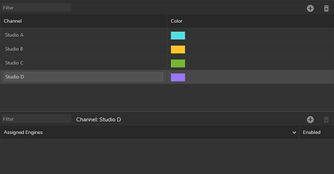 The image above illustrates that several Channels (Studio A, B, C, D) are created, and their color changed. Our channel setup is ready for the Engine assignment process.