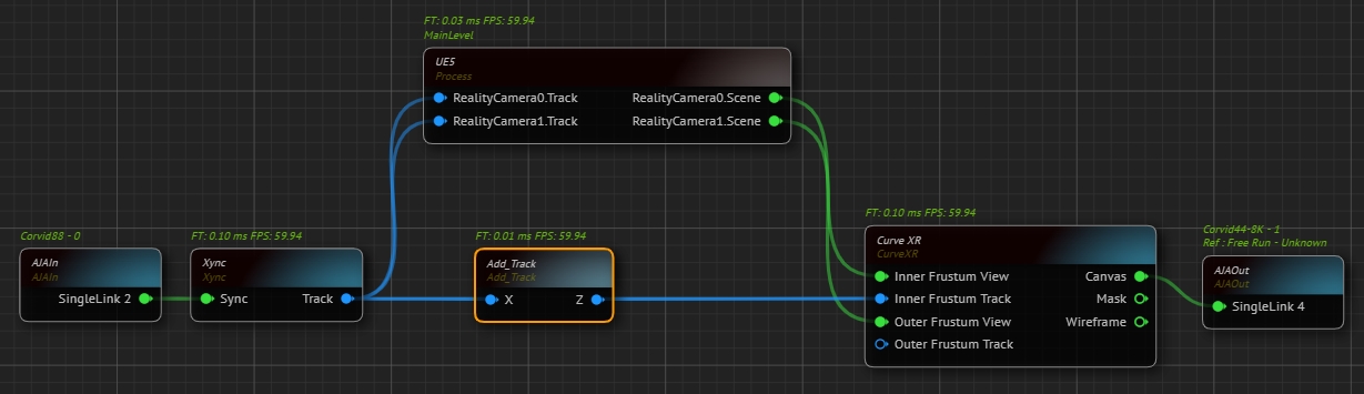 - Connect the - Zoutput of the- Add Tracknode into- Inner Frustum Trackinput pin of the- Curve XRnode.