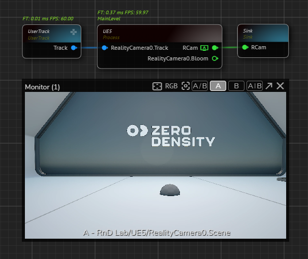 * Create <mark style="color:yellow;">**`UserTrack`**</mark>, <mark style="color:yellow;">**`UE5`**</mark> and <mark style="color:yellow;">**`Sink`**</mark> nodes, activate the APM on <mark style="color:green;">**`RealityCamera`**</mark> output pin, as illustrated above.