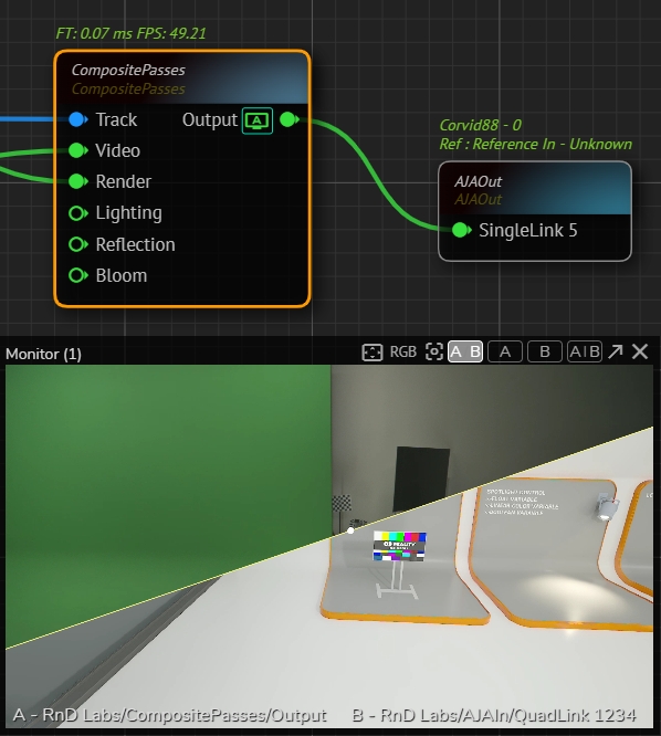 The screen symbol with letter on the Composite Passes node's Output pin indicates the which pin is currently monitored.