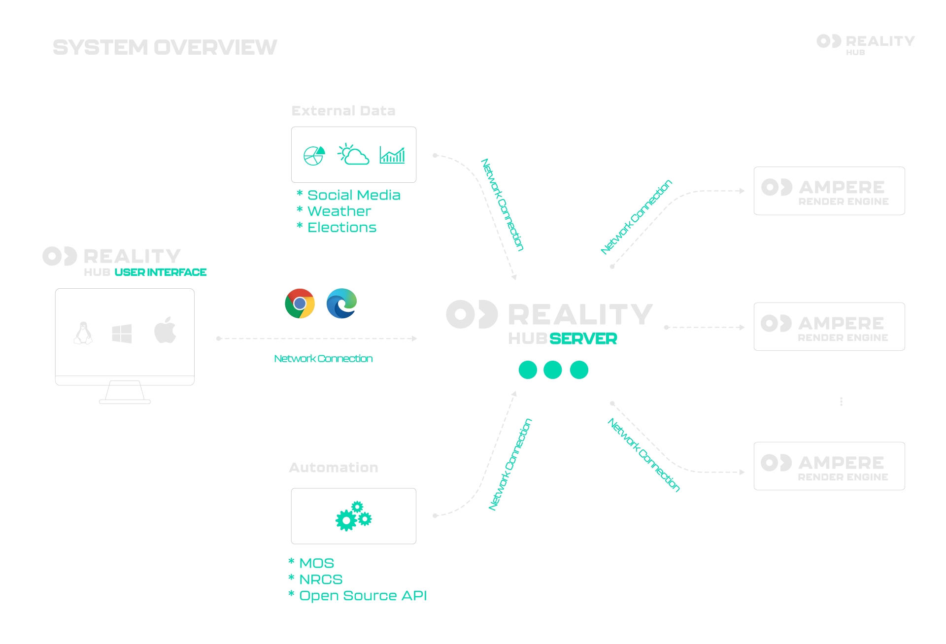 Reality Hub’s pipeline is easy to understand. To utilize Reality Engine(s) & Unreal Engine(s), users log in to the Reality Hub Web Interface with Google Chrome or Microsoft Edge; then, Reality Hub Server establishes connections, receives external data, and sends commands to Engine(s) through the IP network.